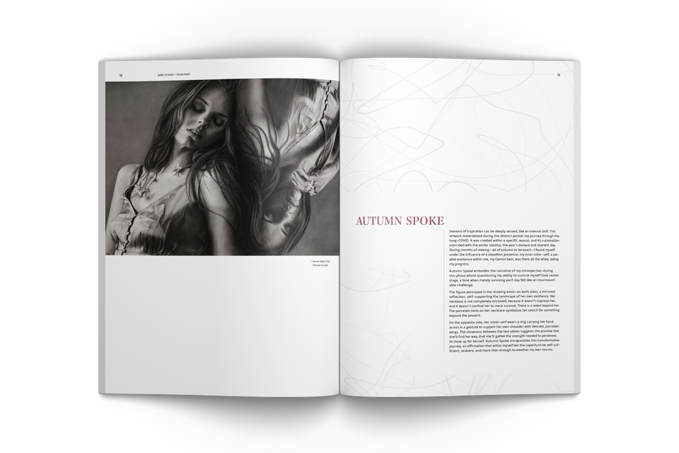 The purpose of this project was to develop a visual system for a chosen exhibition and create design materials to showcase and support the beautiful artworks of the artist. The exhibition should benefit from elevated design and extended promotional materials. My choice was Julie Grantz‘s Disarmed exhibition. It was held at the Triton Museum of Art (Santa Clara, CA) on August 26–December 30, 2023.